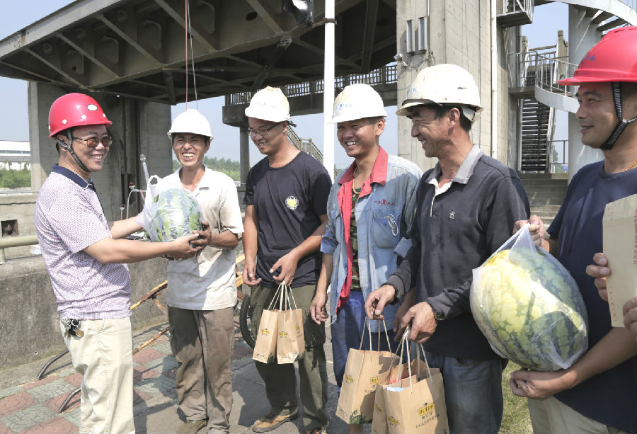 7月25日,水機(jī)公司黨委書(shū)記田建京、工會(huì)主席黃統(tǒng)及相關(guān)項(xiàng)目負(fù)責(zé)人一行8人前往芒稻閘、邵仙閘項(xiàng)目施工現(xiàn)場(chǎng)開(kāi)展 “送清涼”活動(dòng),慰問(wèn)戰(zhàn)斗在高溫酷暑下的一線(xiàn)員工,送去防暑降溫用品、西瓜和慰問(wèn)金,囑托現(xiàn)場(chǎng)員工注意施工安全,合理調(diào)整作息時(shí)間,采取必要的防暑降溫措施,團(tuán)結(jié)一心,攻堅(jiān)克難,確保優(yōu)質(zhì)高效地完成項(xiàng)目施工任務(wù)。